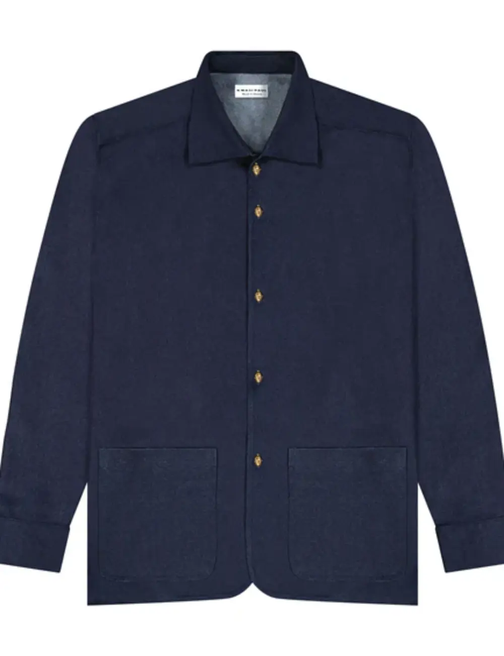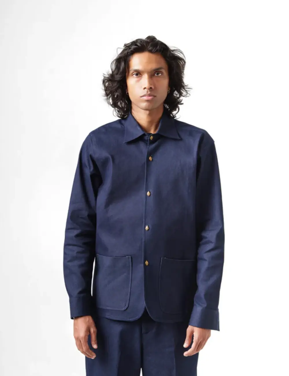 A meeting of tradition and utility. The Ashanti Mask Denim Shirt is cut with sleek precision – two structured pockets, clean seams, and an architectural silhouette that nods to modern workwear. Each button is cast in the form of an Ashanti-inspired mask, transforming function into symbolism. Industrial in spirit yet spiritual in detail, it captures the dialogue between craftsmanship, identity, and the everyday uniform.