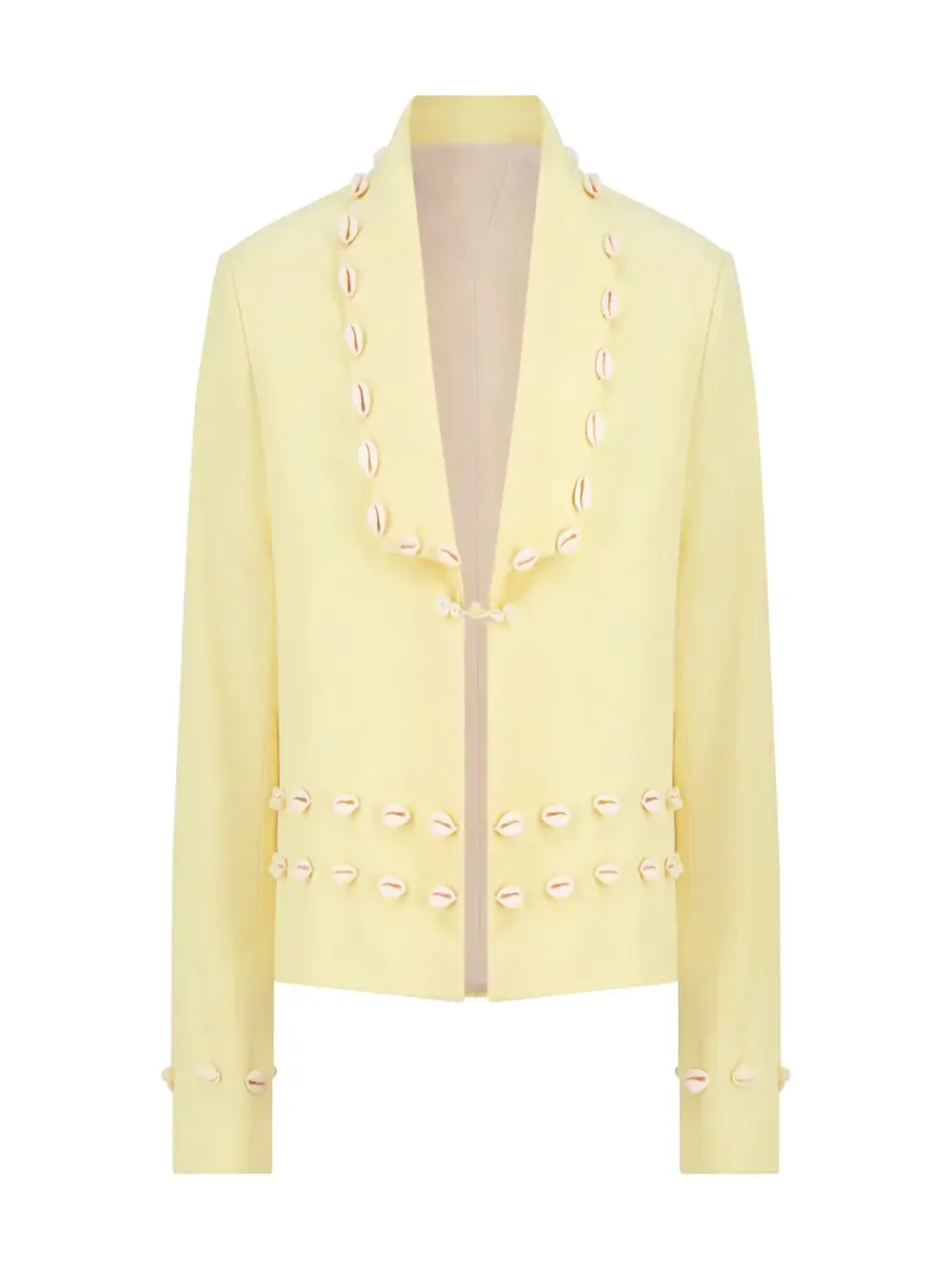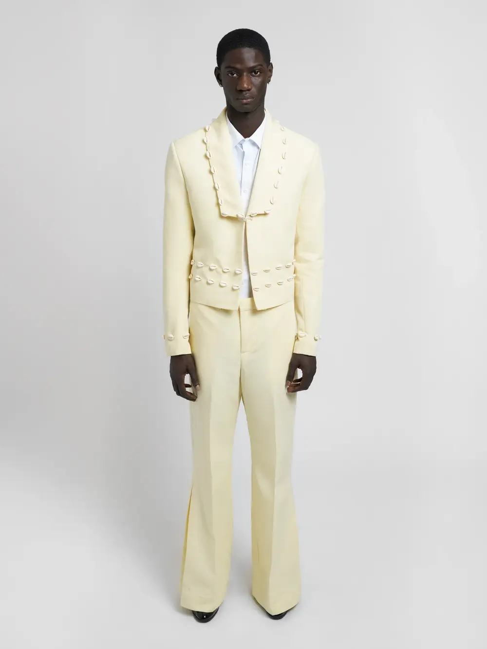 A tailored ode to heritage and craftsmanship. Each cowrie shell is hand-placed – a quiet nod to the ancient trade routes that once defined wealth and exchange across West Africa. Cut in a structured silhouette, the blazer bridges past and present: sharp New York tailoring meets the spiritual language of the cowrie. A garment that speaks softly, yet holds history in every seam.